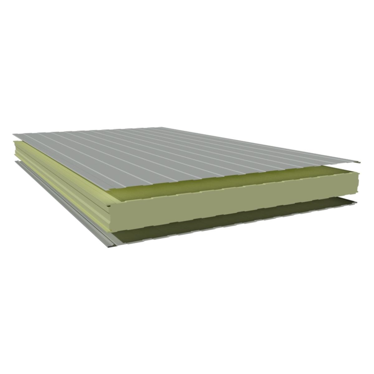 DESCRIPCIÓN Panel constituido por dos láminas de acero, con núcleo aislante de poliuretano (PUR) de alta densidad de 35 - 40 kg/m3 (con tolerancia de ± 2 kg/m3), por lo que se obtiene una solución de revestimiento o cielo aislado en un solo producto con excelentes propiedades térmicas, siendo su principal uso en cámaras frigoríficas. Gama de paneles metálicos aislantes para muros y fachadas con acero Aluzinc ASTM A792, AZ 150 ambas caras en acero pre-pintado con pintura de poliéster líquida de espesor 25 micras sobre poliuretano. Panel de poliuretano inyectado de dos componentes (diisocianatos y polioles).